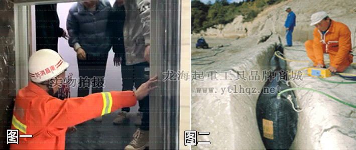 圖一、開啟電梯門:救援起重氣墊本體高度僅22mm-25mm,把起重氣墊放入電梯門窄縫中,充氣可1分鐘內膨脹,解決了電梯狹窄縫隙作業難題,節省救援時間。