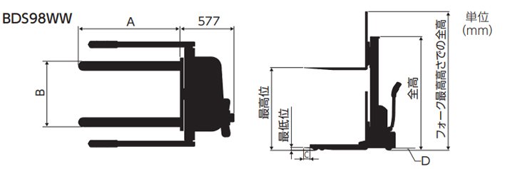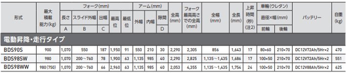 BDS高行程液壓堆高車介紹 BDS高行程液壓堆高車,載荷900kg、980kg,質保12個月,多用于汽車裝卸及車間等場合,電動升降、行駛型,不需要駕照,作為叉車的替代品大受好評,充電時間約8~10小時,行駛速度為2.5km/h。更多產品可以訪問:液壓堆高車 BDS90S高行程液壓堆高車 載荷900kg 運行速度:空載3km/h,負載3km/h 電池:DC12V72Ah(5)x2個(屏蔽電池) 充電器:AC100V,10A(內置) 特點一根桅桿可提供良好的正面視野 BDS98SW高行程液壓堆高車 載荷980kg 運行速度:空載3km/h,負載3km/h 電池:DC12V72Ah(5)x2個(屏蔽電池) 充電器:AC100V,10A(內置) 單桅桿、可移動式,視野好,叉和臂的寬度可以改變,放在地板上的托盤可以直接拿起 BDS98SW高行程液壓堆高車 載荷980kg,可以向貨物舉起至3000mm的地方 日本BISHAMON BDS高行程液壓堆高車為日本原裝進口產品,保質1年,我公司承諾凡是客戶在我公司定購的進口類產品均為原裝正品,絕不存在拆件貨,換件貨,假冒品牌產品,凡客戶從我公司定購日本BISHAMON產品如收到貨物時發現有拆件貨,換件貨,假冒、假貨仿貨均以100倍金額賠償。