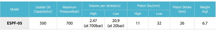 TECPOS ESPF腳踏液壓泵資料 【產品名稱】ESPF腳踏液壓泵 【產品品牌】韓國TECPOS原裝進口,20多年經驗 【產品質?!?/span>12個月 【產品分類】腳踏液壓泵 【產品型號】ESPF-05,實物圖如下: TECPOS ESPF腳踏液壓泵規格 可用機油容量500cc 每沖程容積(高)2.47 cc/沖程 每沖程容積(低)20.9毫升/沖程