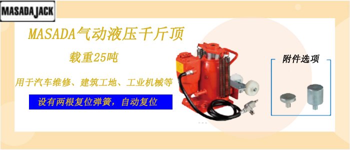 【產品名稱】MASADA氣動液壓千斤頂 【產品品牌】日本MASADA 【產品保質】12個月 【典型應用】適用于大型巴士、汽車等設備維修、維護。