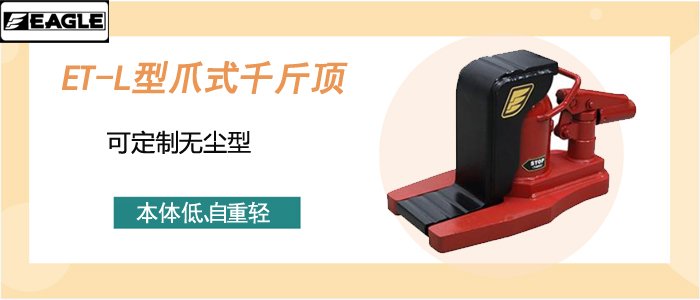 ET-L爪式千斤頂本體更低、爪部加長設計,適合在有高度限制的環境中工作。 【產品名稱】ET-L爪式千斤頂 【產品品牌】日本EAGLE JACK鷹牌千斤頂 【產品保質】保質12個月 【產品定制】ET-L型爪式千斤頂可定制潔凈室型(鍍鎳規格)。 【應用領域】在機械設備維修、倉儲物流以及需要精確控制高度的各種應用場景中,能提供穩定可靠的支撐和頂升功能?。