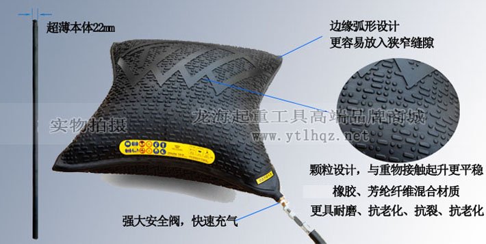 ●1噸~5噸起重氣墊的高度僅22mm,可以用在小縫隙空間; ●1噸~5噸起重氣墊的重量輕,與其它施工設備相比輕和易于處理的; ●1噸~5噸起重氣墊可以快速的操作,1分鐘完成充氣,簡單快捷; ●起重氣墊無傳統起重搬運工具的滑動部件,幾乎免維護。