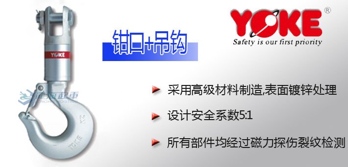 測試認證: ● YOKE重力旋轉環8-308,設計安全系數5:1; ● YOKE重力旋轉環—鉗口+吊鉤,測試認證時,獨立測試載荷為安全工作負荷的2倍; ● YOKE重力旋轉環—鉗口+吊鉤,所有部件均經過磁力探傷裂紋檢測。 |